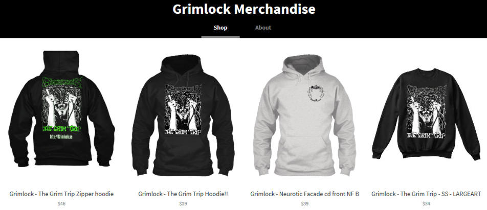 Who is Gasher T. Grimlock?Back when Grimlock first formed, Brian Tonne had the idea of having a mascot. He drew this guy coming out of a grave. Later we had our friend John Althofff draw up the guy on our shirts. John was responsible for all of Grimlock’s artwork and created some true masterpieces.